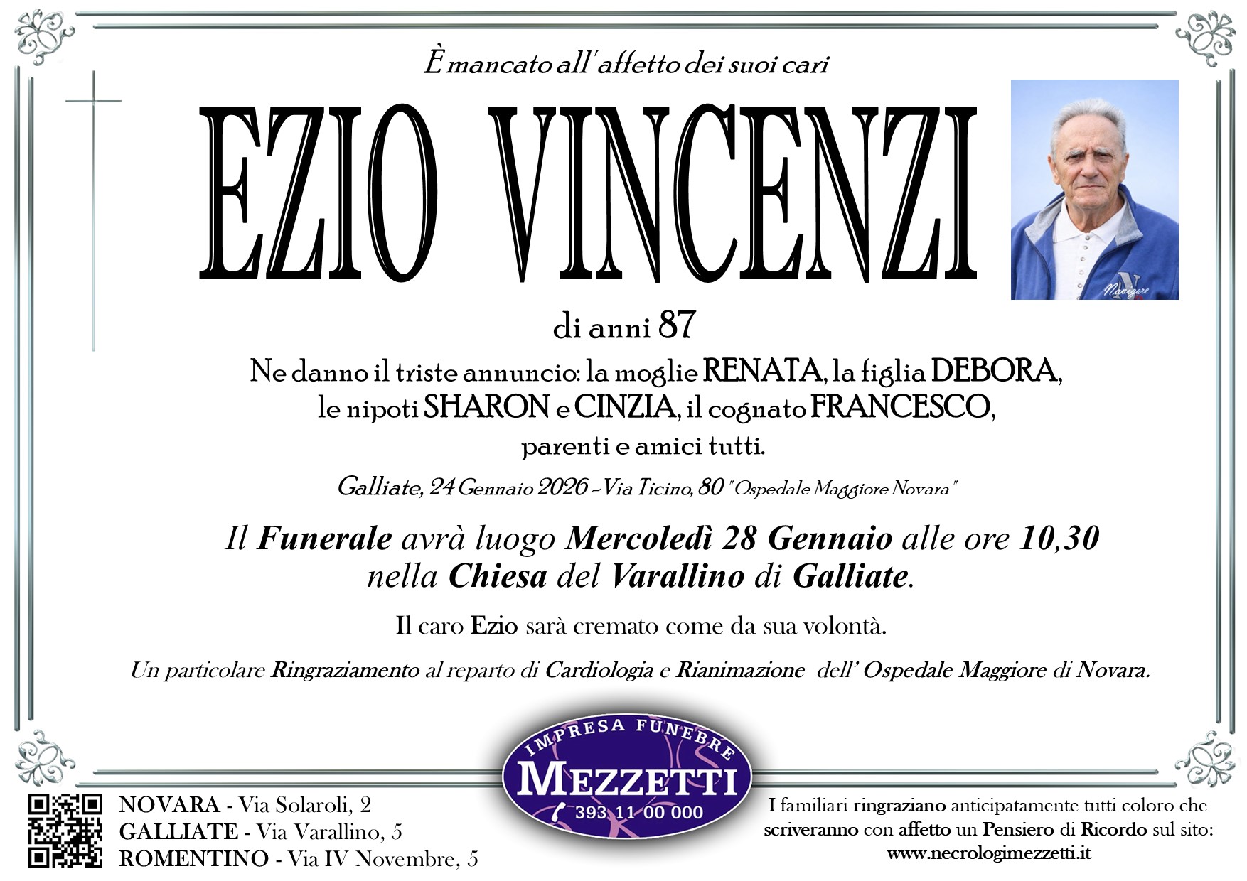 I familiari ringraziano anticipatamente tutti coloro che parteciperanno alla cerimonia funebre e tutti coloro che scriveranno con affetto un Pensiero di Ricordo.