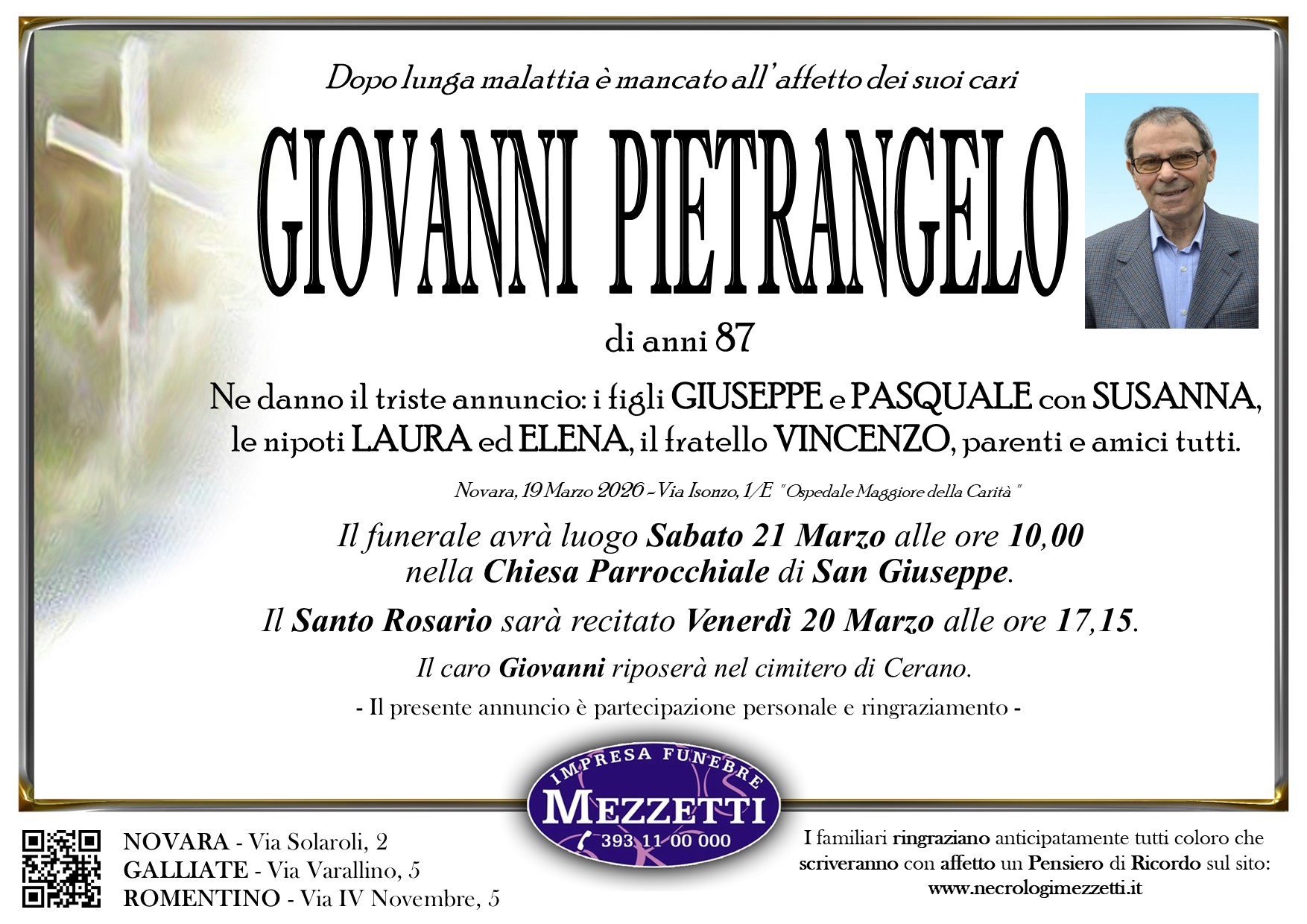 I familiari ringraziano anticipatamente tutti coloro che parteciperanno alla cerimonia funebre e tutti coloro che scriveranno con affetto un Pensiero di Ricordo.