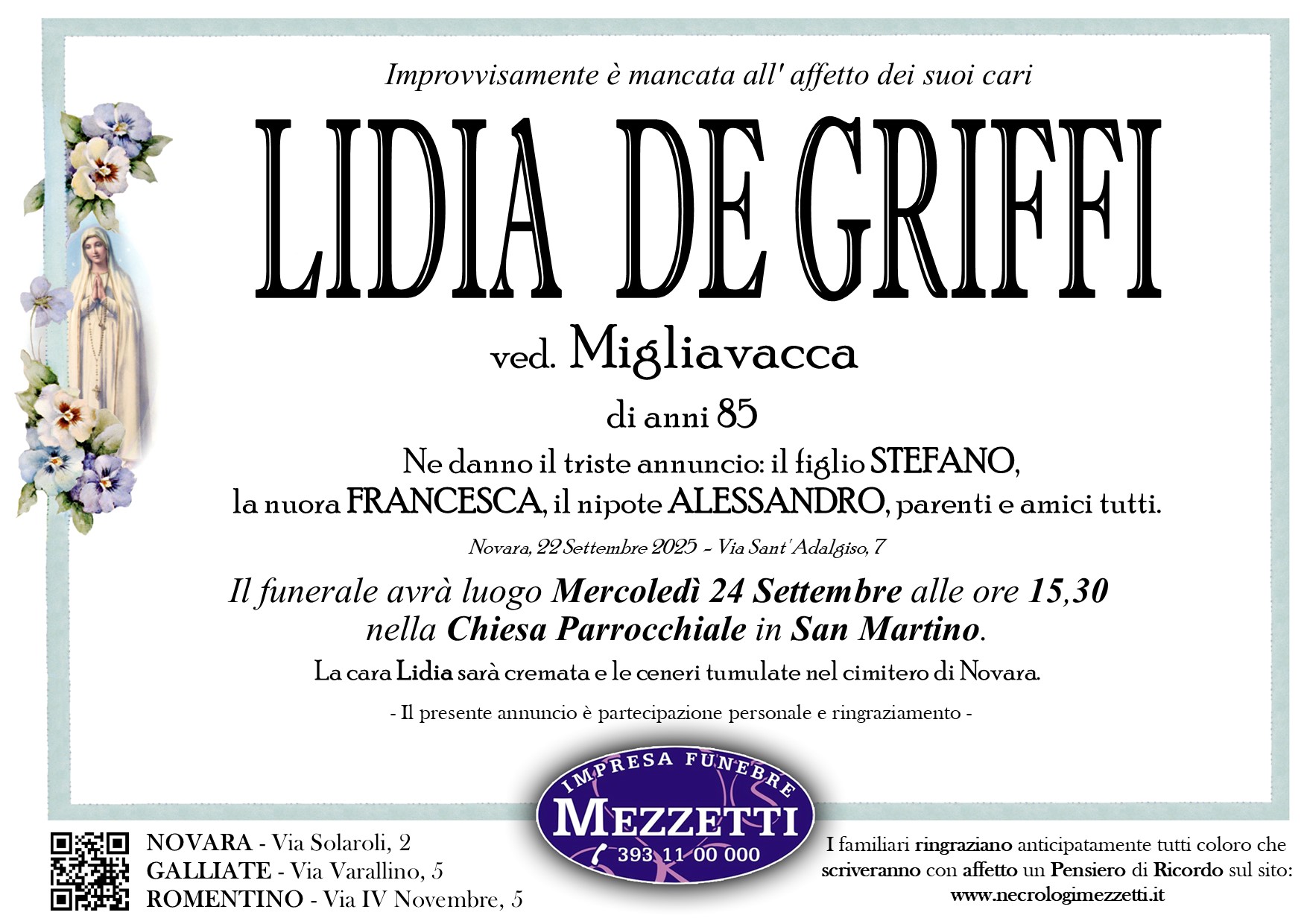 I familiari ringraziano anticipatamente tutti coloro che parteciperanno alla cerimonia funebre e tutti coloro che scriveranno con affetto un Pensiero di Ricordo.